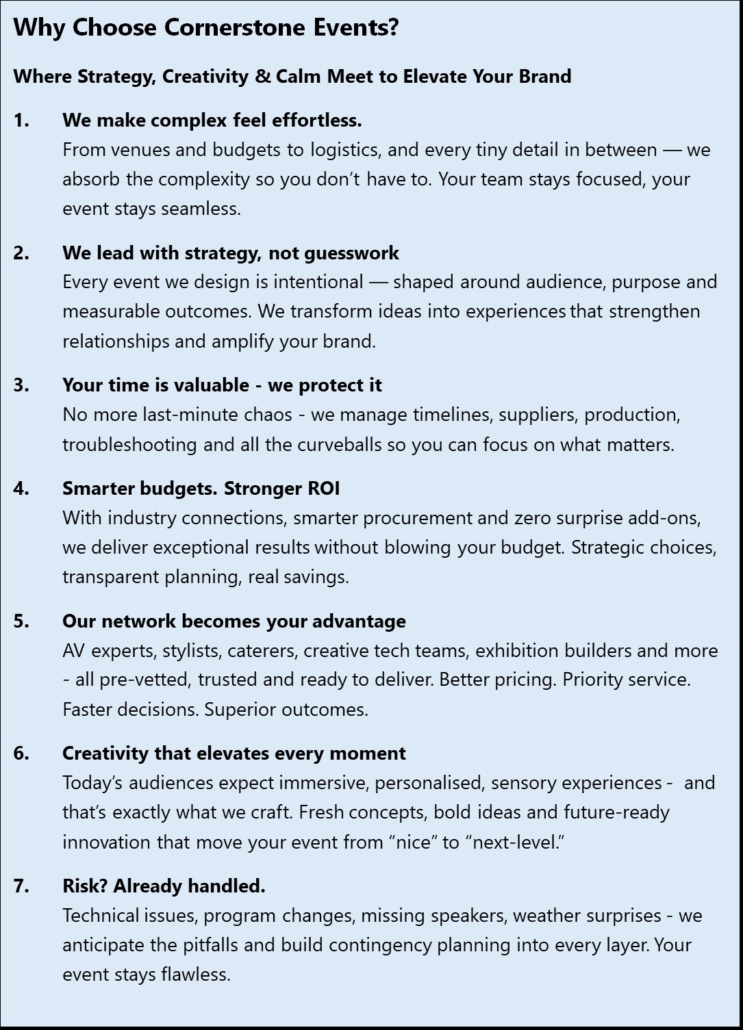 Every touchpoint at an event is a reflection of who you are. A rushed, under-resourced or poorly executed event can dilute your message and damage trust.